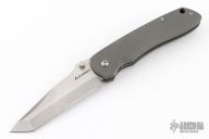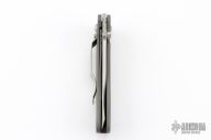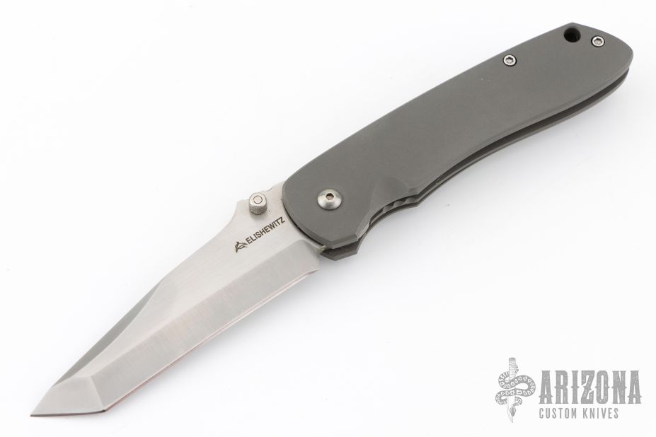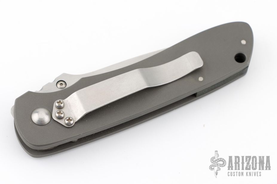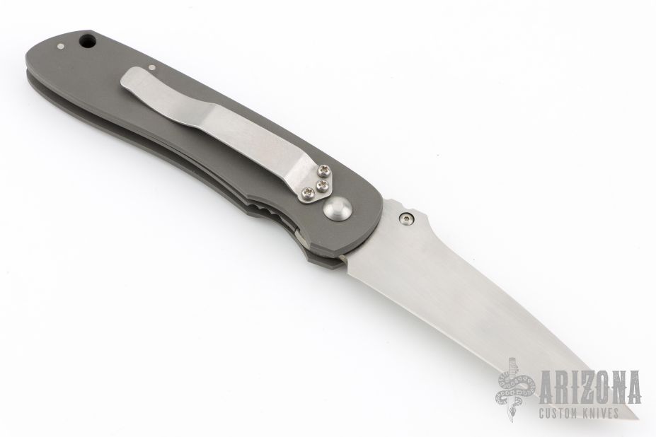 This linerlock folder features a chisel ground tanto recurve blade with hand rub satin finished flats, and satin finish bevels, notched thumbrest and single knurled thumbstud. The handle has bead blasted titanium covers, and bead blasted titanium liners, black G-10 backspacer, and a tip up bead blasted stainless steel clip. Smooth action. Nice lockup and blade seating. Has a couple light scuffs and scratches, great condition otherwise.