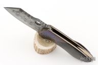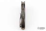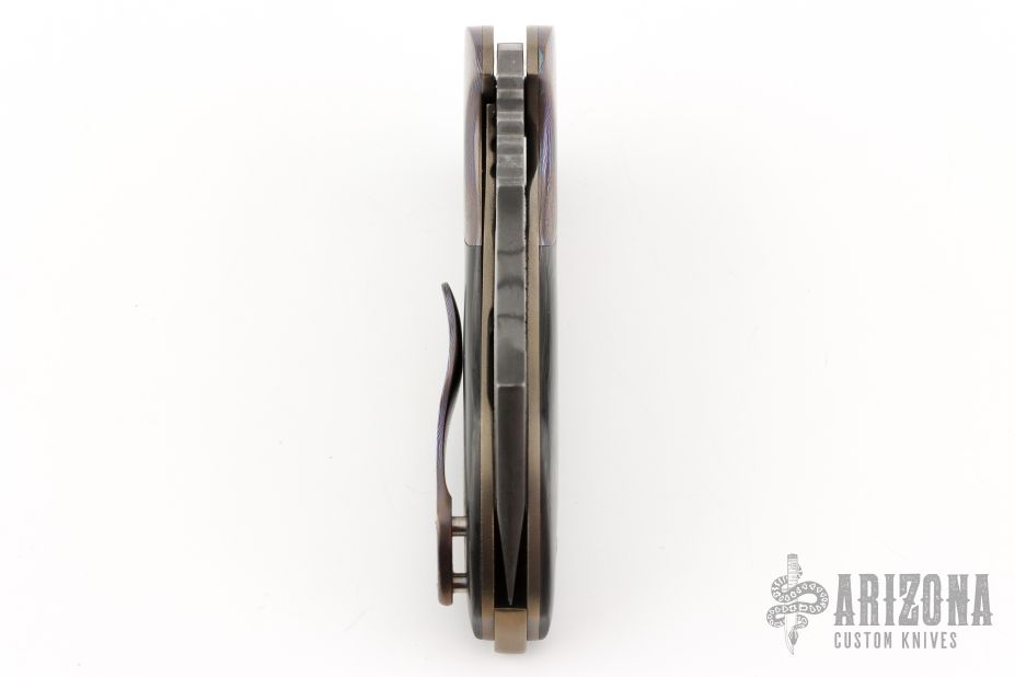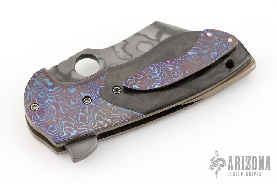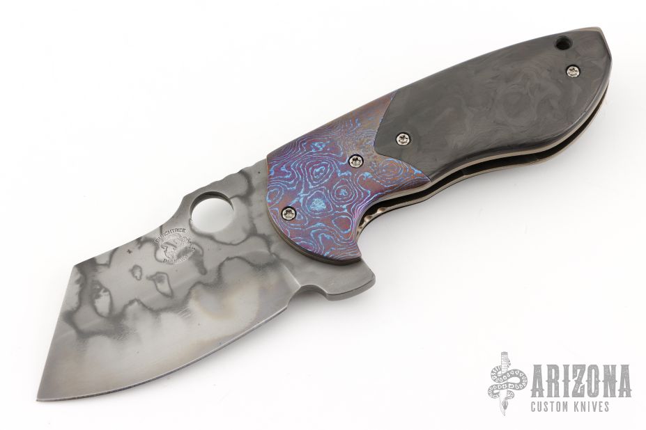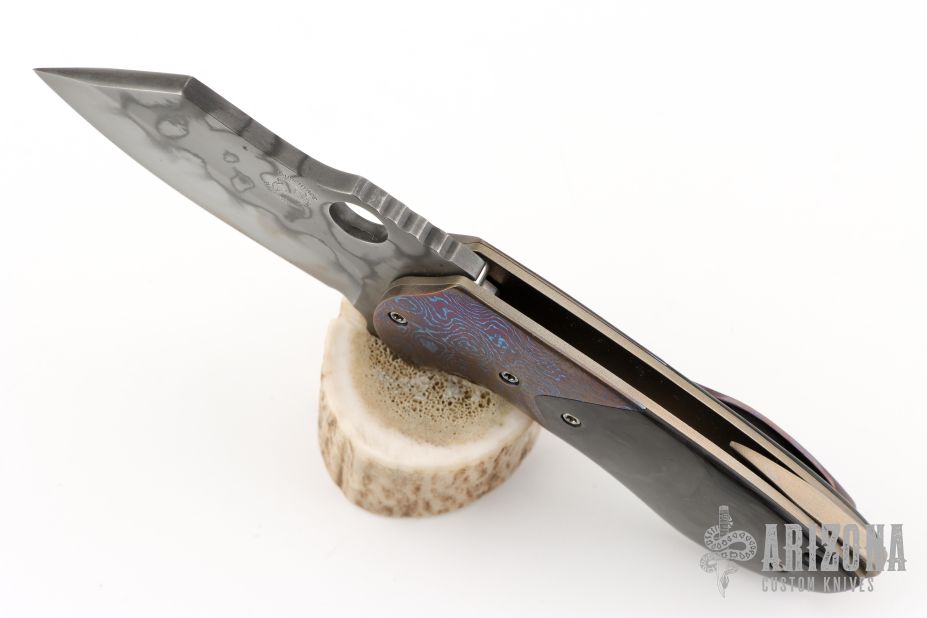 This Mini Dao flipper from Michael Burch features a hand rub satin finished blade with nice hamon, thumbhole, notched thumbrest and flipper. The handle has orange peel finished MokuTi bolsters, marble carbon fiber scales, orange peel finished and anodized titanium liners, MokuTi tip up clip, orange peel finished titanium backspacer. Nice detent, lockup and blade seating, rides on bearings. Excellent condition. Comes with a zippered case.