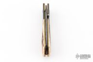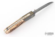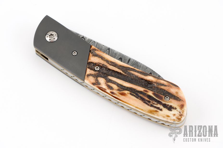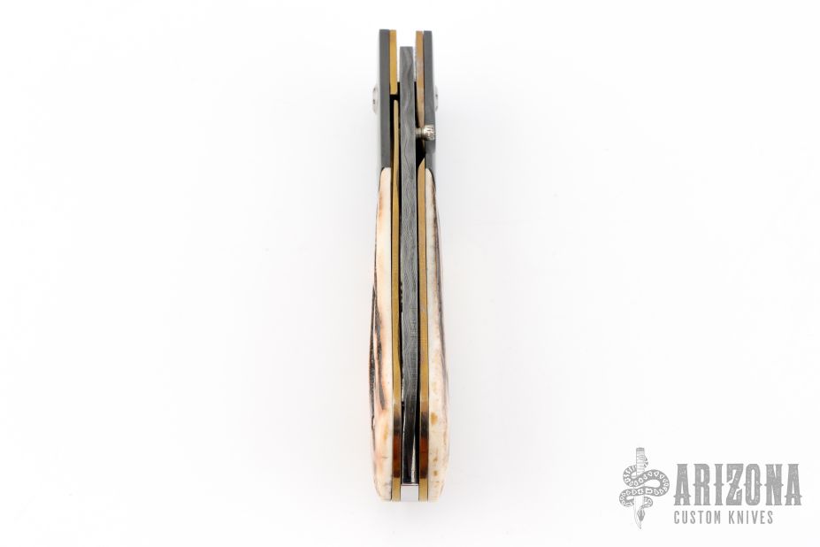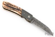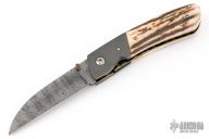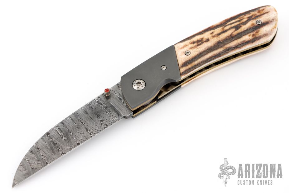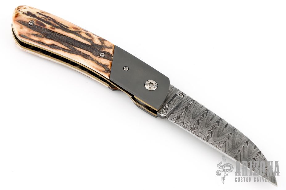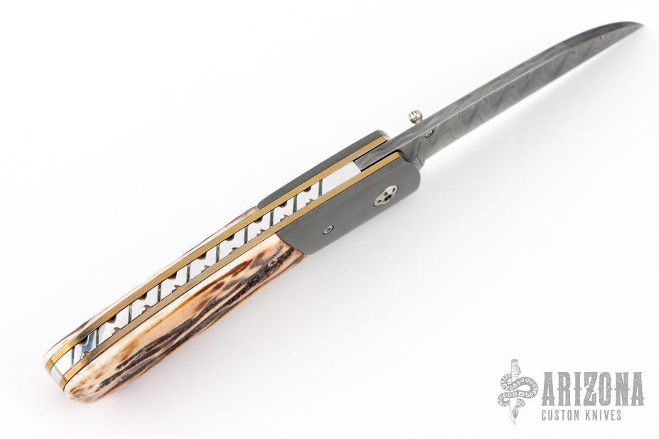 This linerlock folder by Mike Tyre features a Damascus blade with a single thumbstud with citrine inlay. The handle has dovetailed zirconium bolsters, stag scales, anodized titanium liners and a fileworked stainless steel backspacer. Nice detent, lockup and blade seating. Comes with zipper case and COA. New from maker!