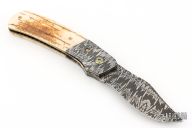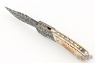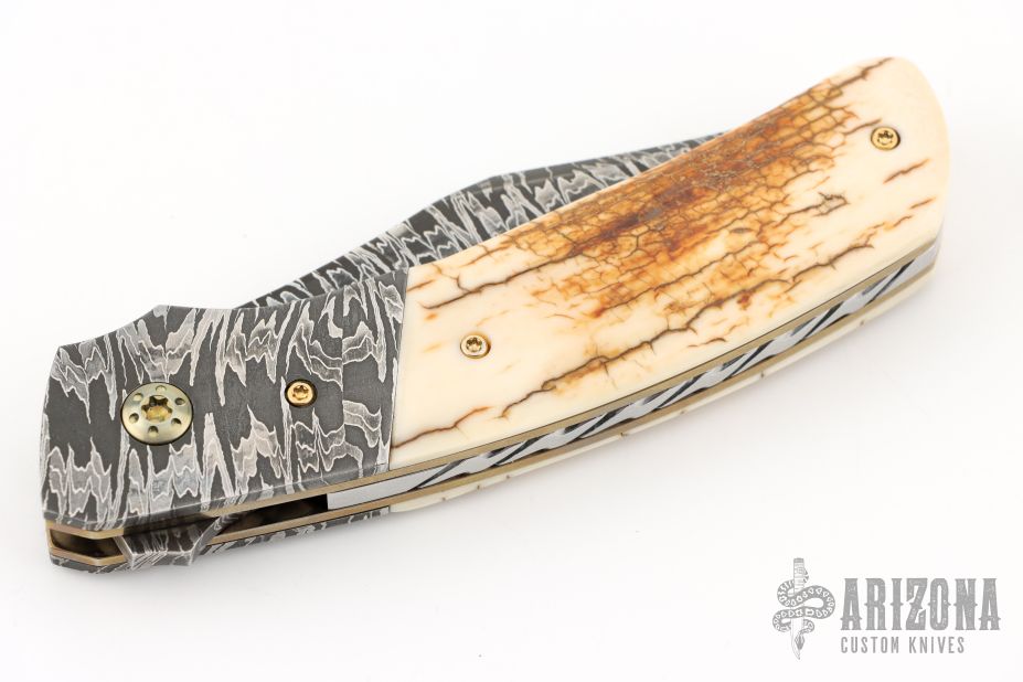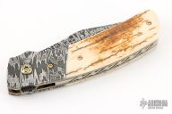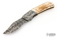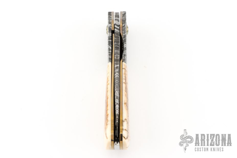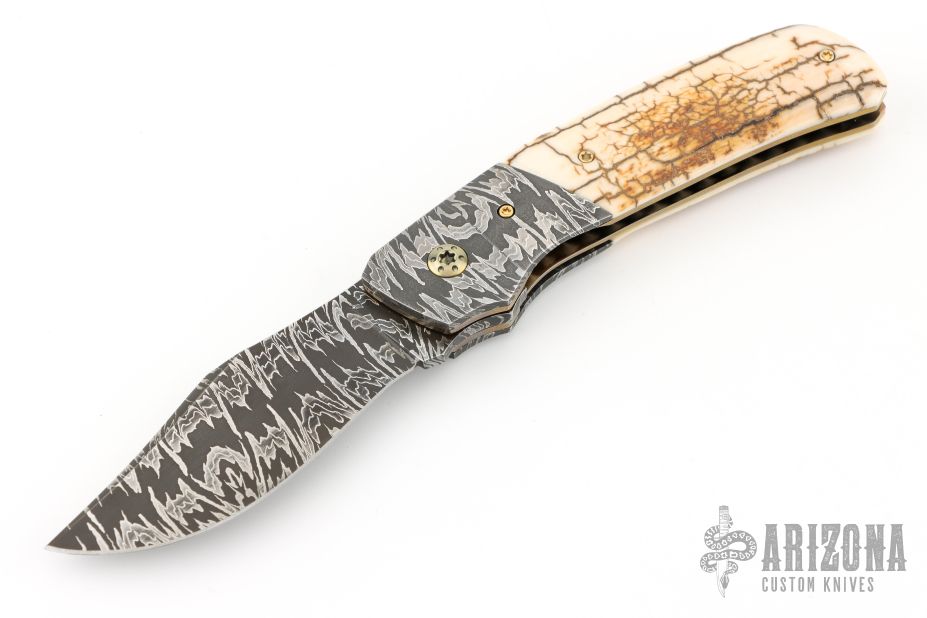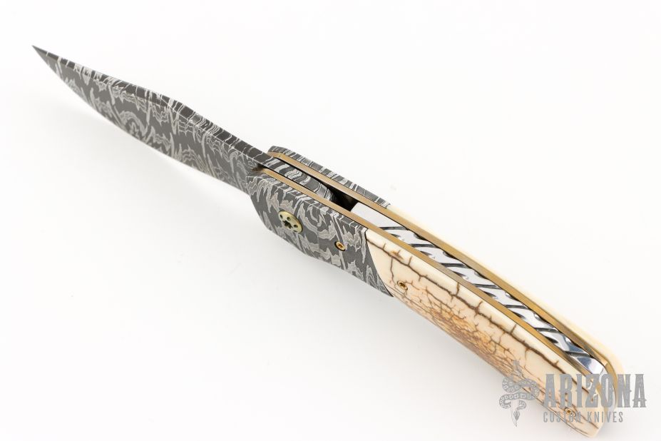 This linerlock flipper by Mike Tyre features an Inferno Flames Damascus blade with flipper. The handle has matching Damascus bolsters, bark mammoth ivory scales, anodized titanium liners and a fileworked stainless steel backspacer. Nice detent, lockup and blade seating. Comes with zipper case and COA. New from maker!