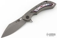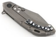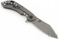 This Wayfarer 247 from Olamic Cutlery features a stone wash blade with a notched thumbrest. The handle has stone wash titanium frame with a titanium guncoated floating backspacer.  Guncoated tip up steel pocket clip. Fordite inlays.  Includes the original padded case and COA.  Nice detent, lock up and blade seating.  Excellent Condition.