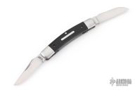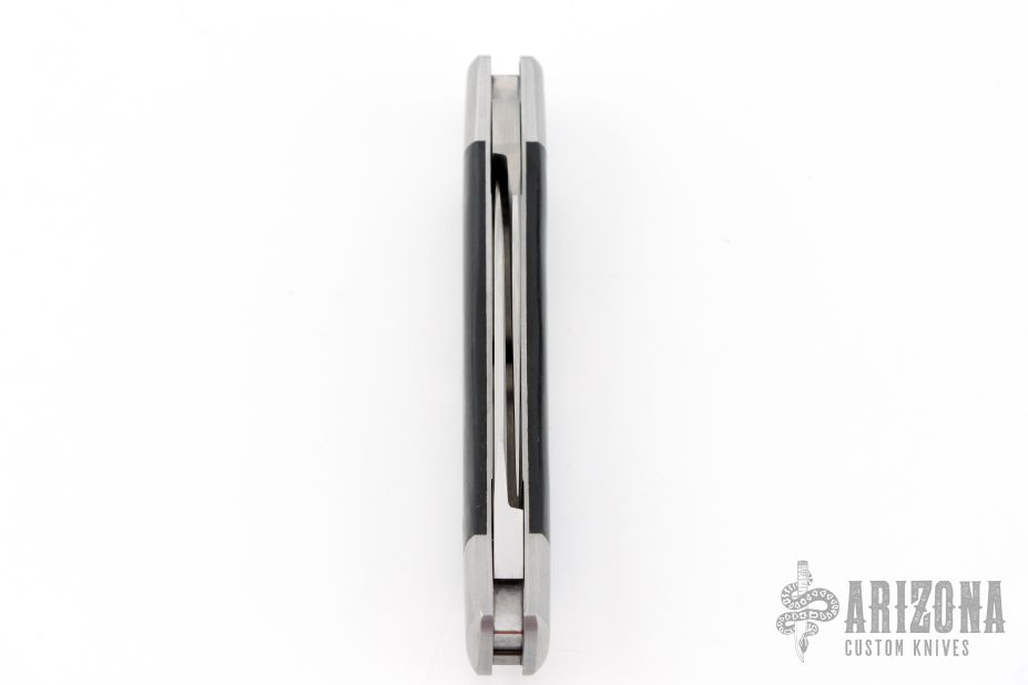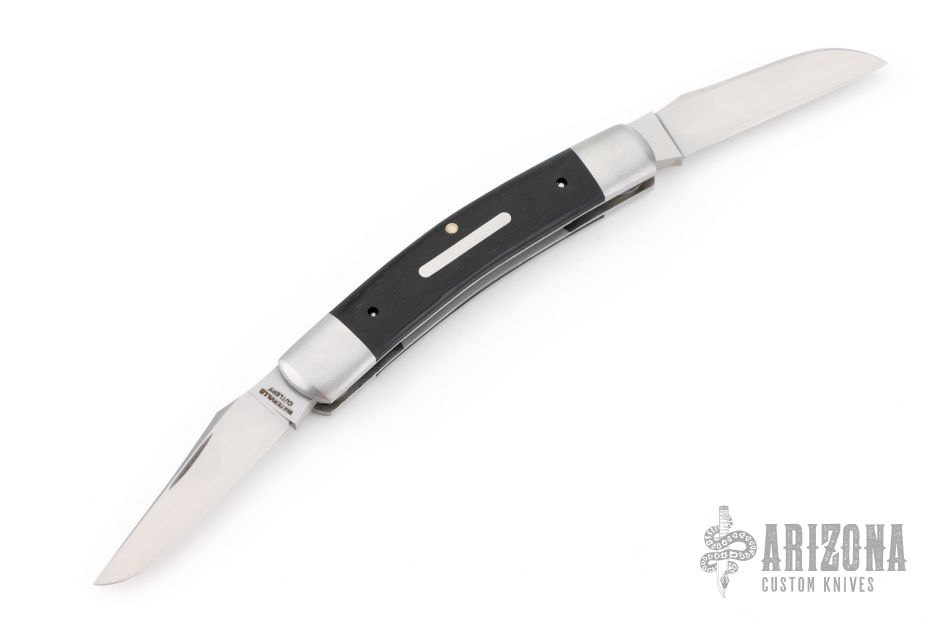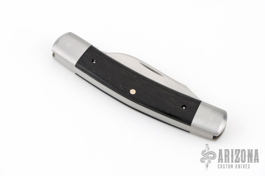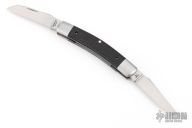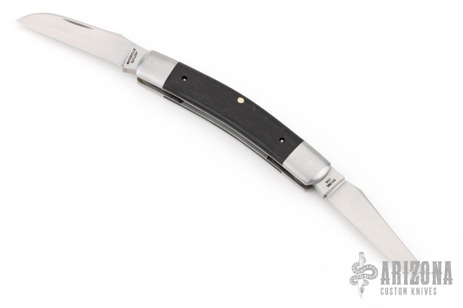 This slipjoint by Matt Collum was made for the 2023 Waterville Custom Collection. It features hand rub satin finished blades with nail nicks. The handle has 416 stainless steel bolsters, ebony wood covers, 410 stainless steel liners, stainless steel spring. Stainless steel escutcheon. Has half-stop, flush in all positions. Comes with a zippered case. New from maker!