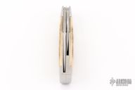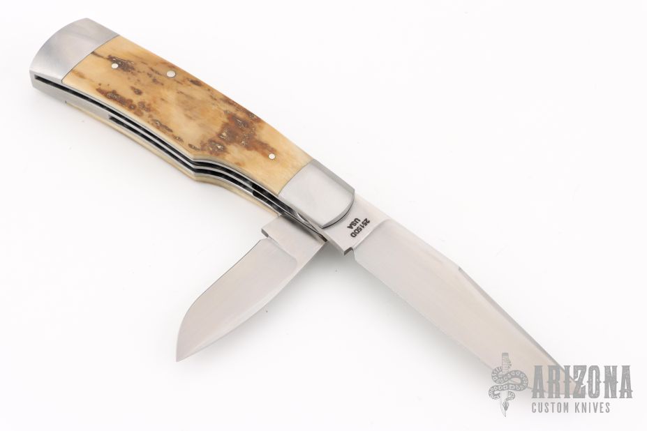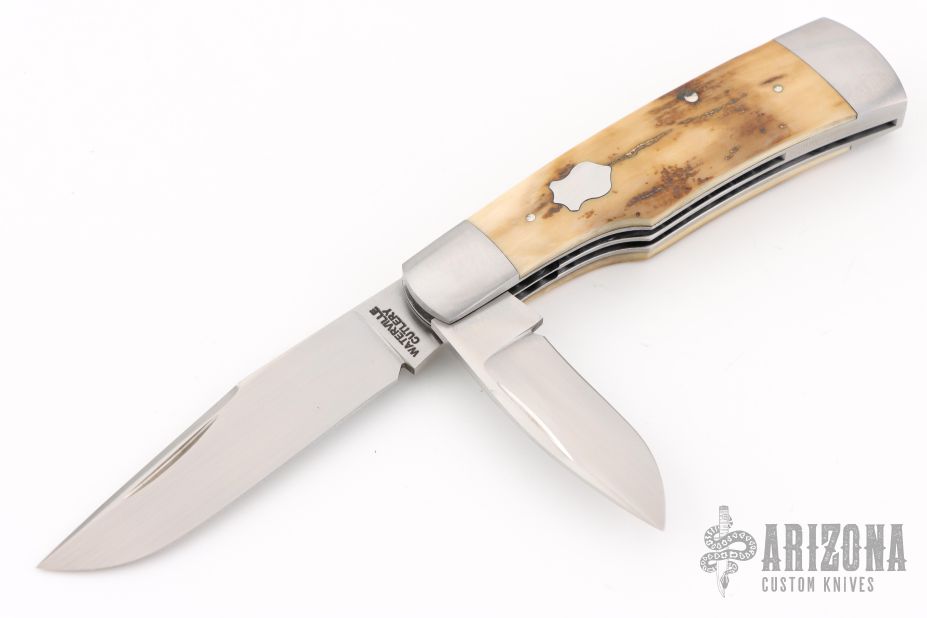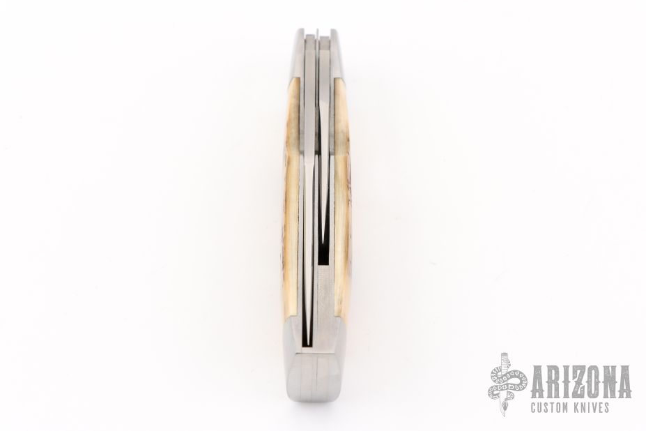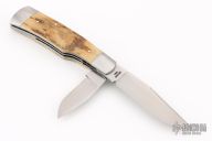 This slipjoint by David R Davis was made for the 2025 Waterville Custom Collection. It features hand rub satin finished blades with nail nicks. The handle has 416 stainless steel bolsters with integral liners, fileworked center stainless steel liner, mammoth ivory covers, stainless steel escutcheon, fileworked stainless steel springs. Stainless steel escutcheon. Has half-stop, flush in all positions. Comes with a zippered case. New from maker!