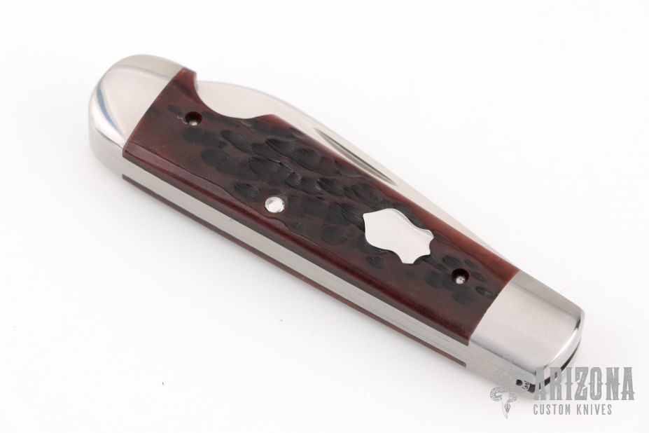 This slipjoint by Charles Vestal was made for the 2024 Waterville Custom Collection. It features a hand rub satin finished blade with nail nick. The handle has stainless steel bolsters with integral liners, jigged bone covers, stainless steel escutcheon, stainless steel springs. Stainless steel escutcheon. Has half-stop, flush in all positions. Comes with a zippered case. New from maker!