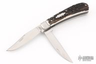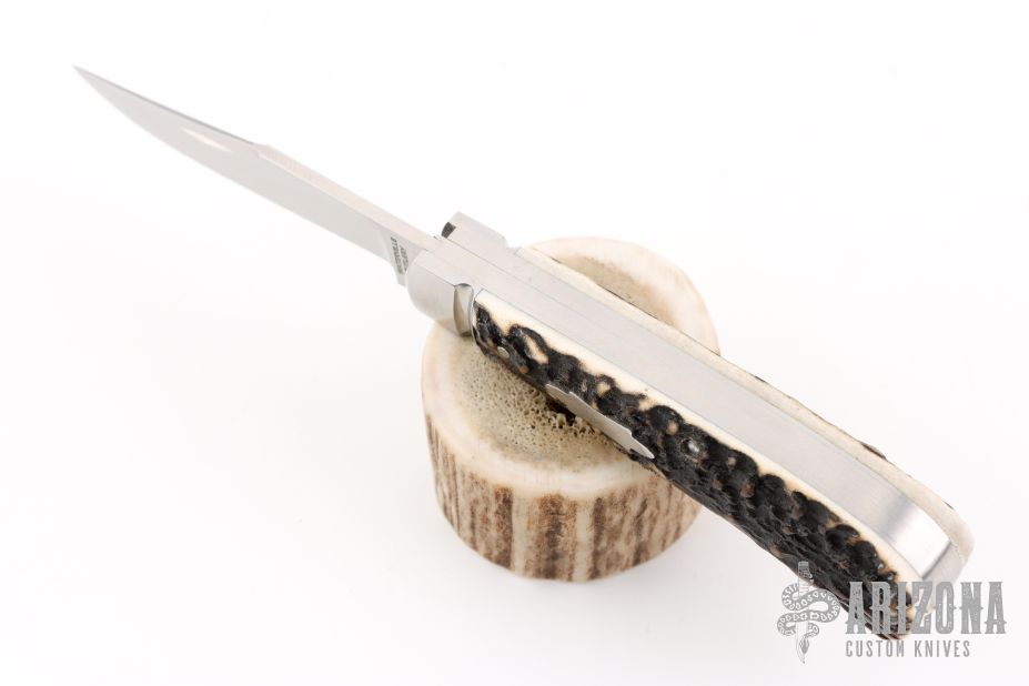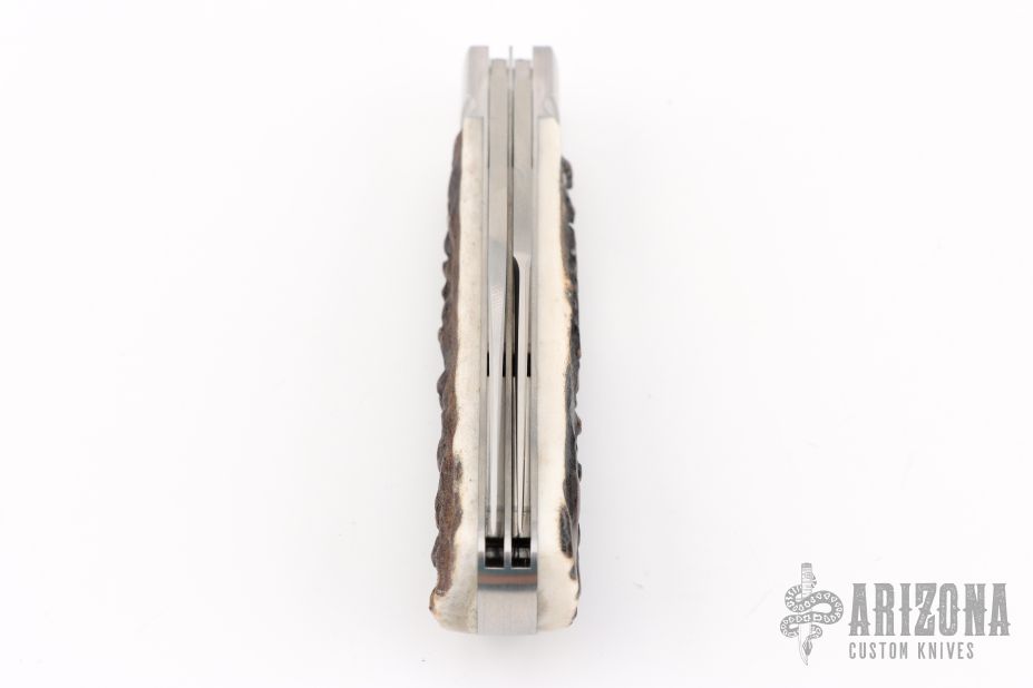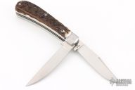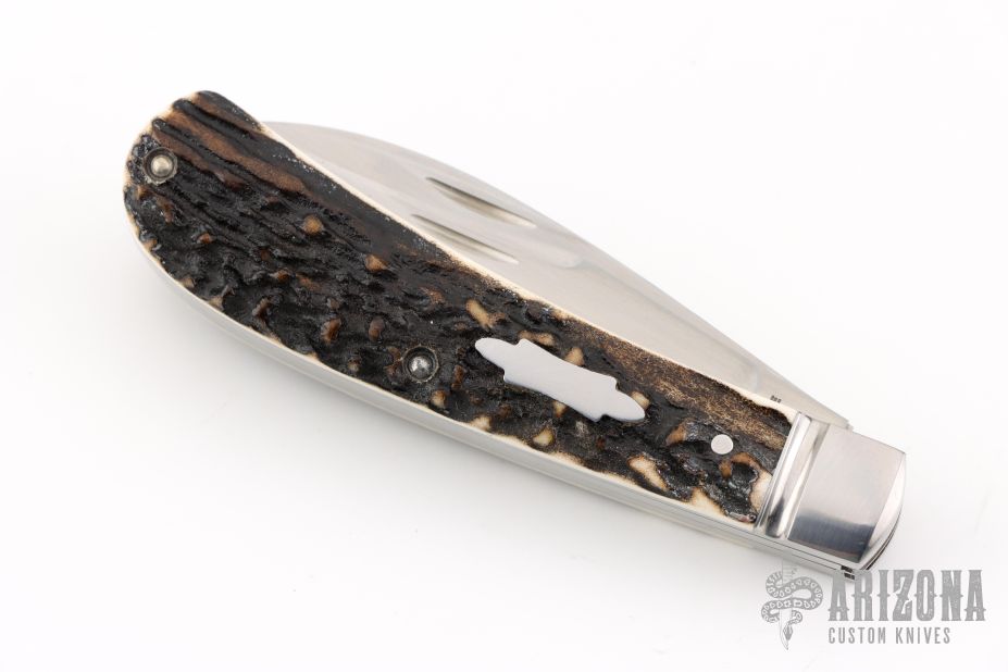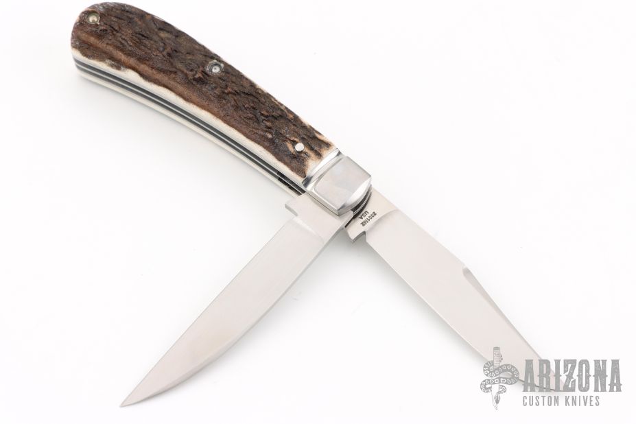 This Wharncliffe Trapper by Mike Zscherny was made for the 2023 Waterville Custom Collection. It features two hand rub satin finished blades with a nail nicks. The handle features stainless steel fluted bolsters, escutcheon and liners, stag covers, stainless steel springs. Has half-stop, flush in all positions. Comes with a zippered case. New From Maker!