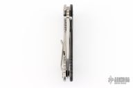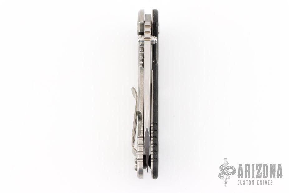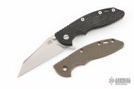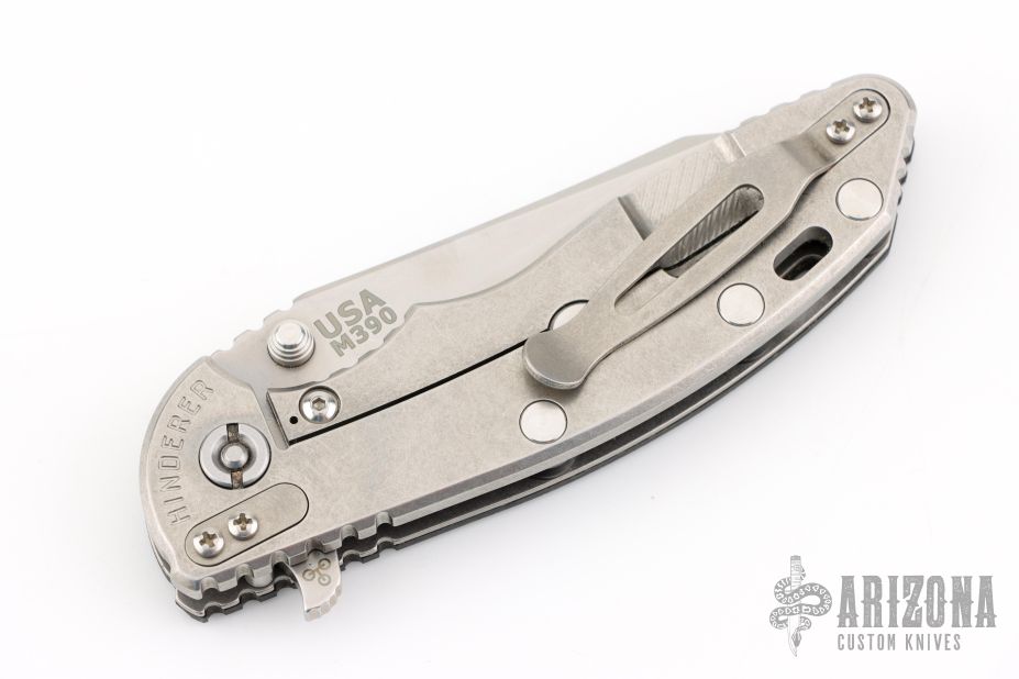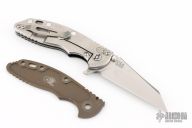 This 3.5" XM-18 from Hinderer Knives has a stonewashed finish wharncliffe blade with notched thumbrest and flipper. The handle has a burlap micarta cover with a stonewashed titanium frame and matching titanium pocket clip. Dual thumb studs and notched thumbrest, anodized titanium barrel spacer. Reversible pocket clip. Strong lock up and nice detent. Comes with original box and card. Listing also includes a Hinderer textured bronze titanium scale. Excellent condition.