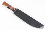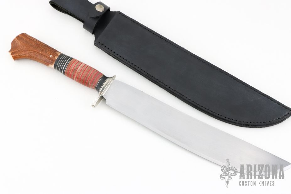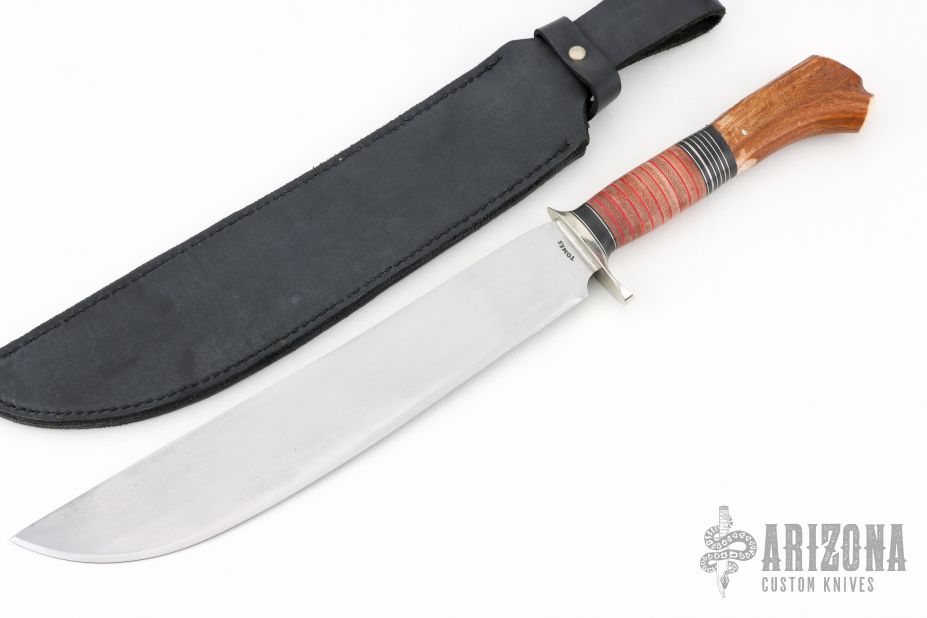 This Machete by Master Smith PJ Tomes features a hand rub satin finished blade with .075" blade stock and 2.082" blade depth, hidden tang construction. The handle has a nickel silver guard with a stacked leather grip with black/nickel silver/red spacers, crotch stag butt with a single nickel silver pin. Comes with a black leather sheath. New from maker at the 2025 Blade Show.