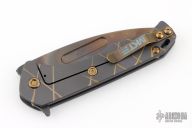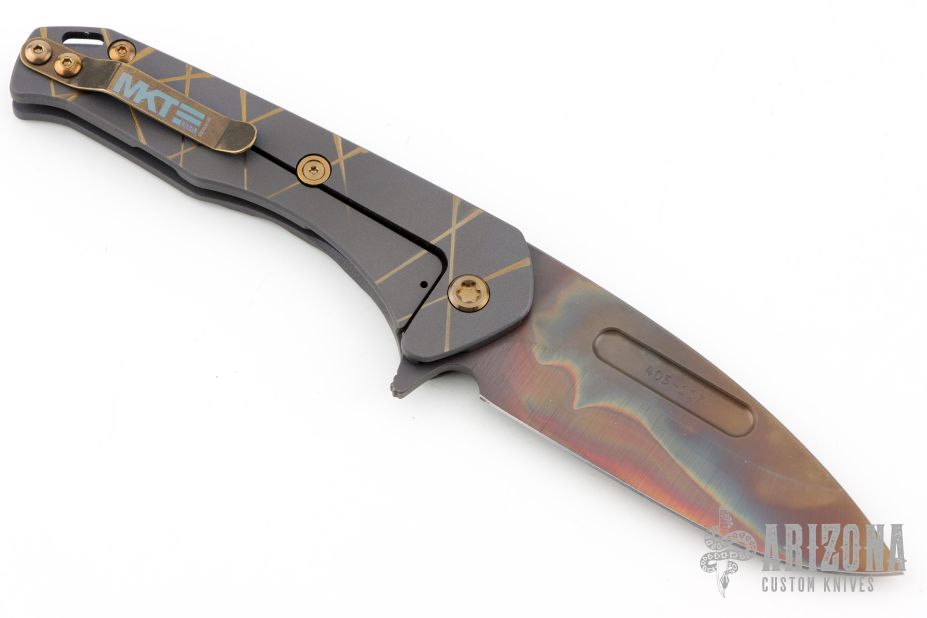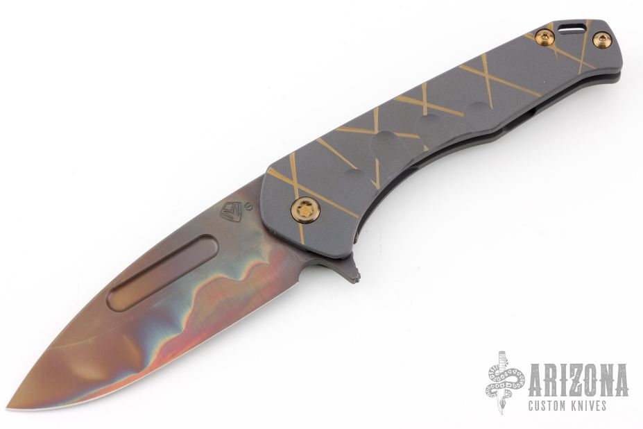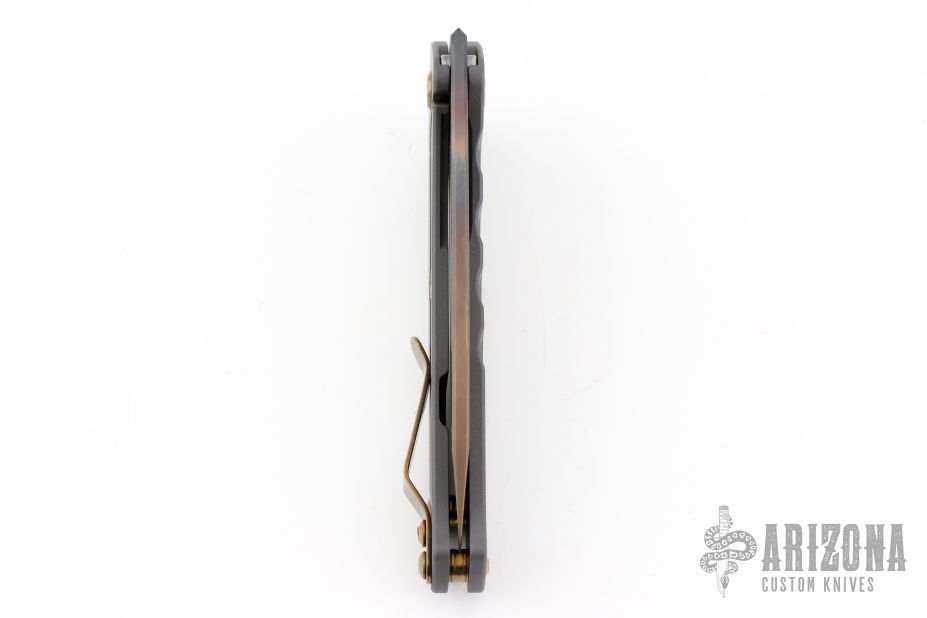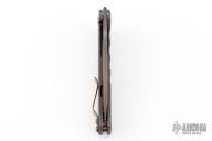 This Praetoarin Slim by Medford Knife and Tool features a Vulcan finished drop point blade with a notched thumbrest. The handle features a laser engraved titanium frame with a matching tip up pocket clip.  Includes the original box and papers. Excellent Condition.