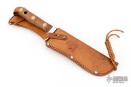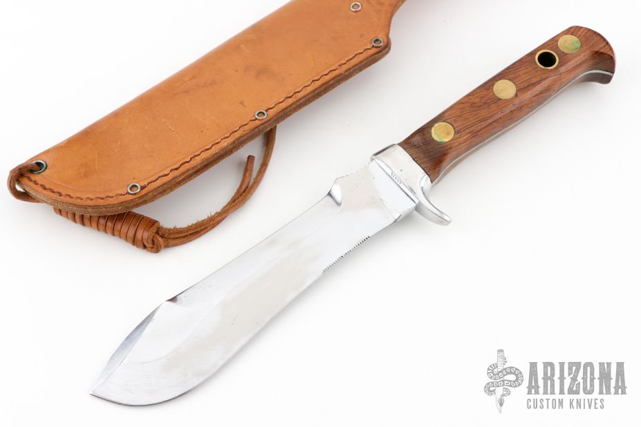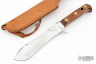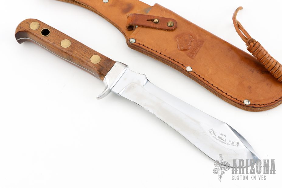 This White Hunter by Puma is the ultimate outdoorsman’s knife, originally designed by African professional hunters. It features a curved blade for cutting, slicing and skinning and a strong back edge for hacking. Handmade by skilled craftsmen with wood scales. #44074 on guard. Made in the fourth quarter of 1970. Comes with original brown leather sheath. Has some scuffs and scratches, great condition for its age.