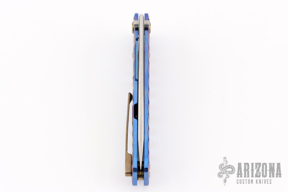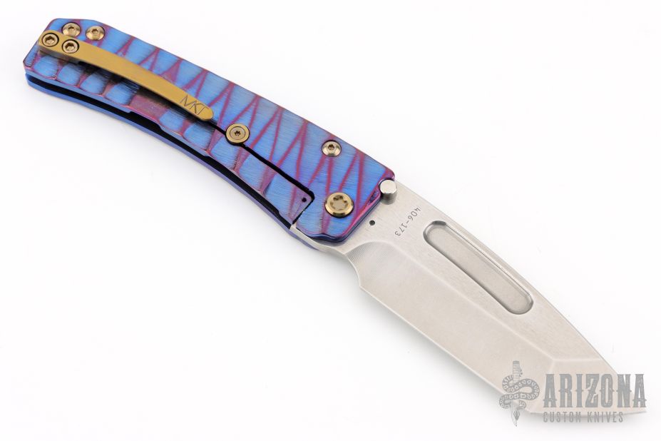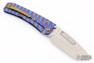 This Midi Marauder from Medford Knife and Tool features a high polished tumbled tanto blade. The handle has a sculpted and anodized titanium frame with tip up clip. Excellent detent, lockup, and seating.  Comes with original box and papers.  Excellent condition.
