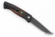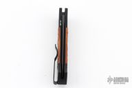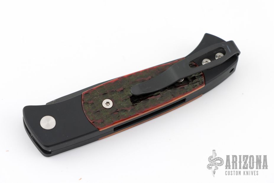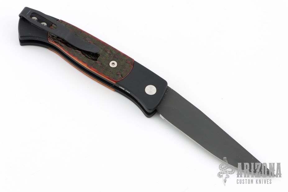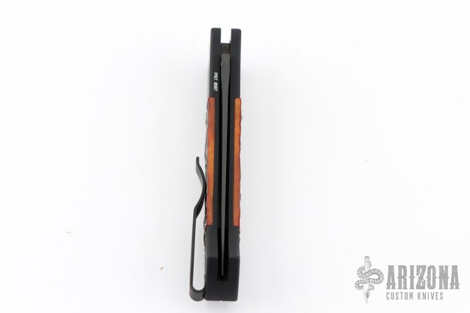 This Small Brend Auto by Pro-Tech features a black finished blade with false top edge. The handle is comprised of a black anodized aluminum frame with jigged bone inlays and a tip up black stainless steel clip. Includes original clamshell box. Has a couple light scuffs, otherwise Excellent condition. PR7 #567