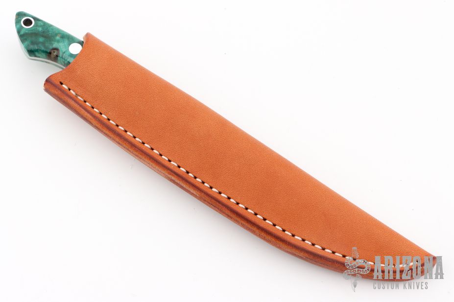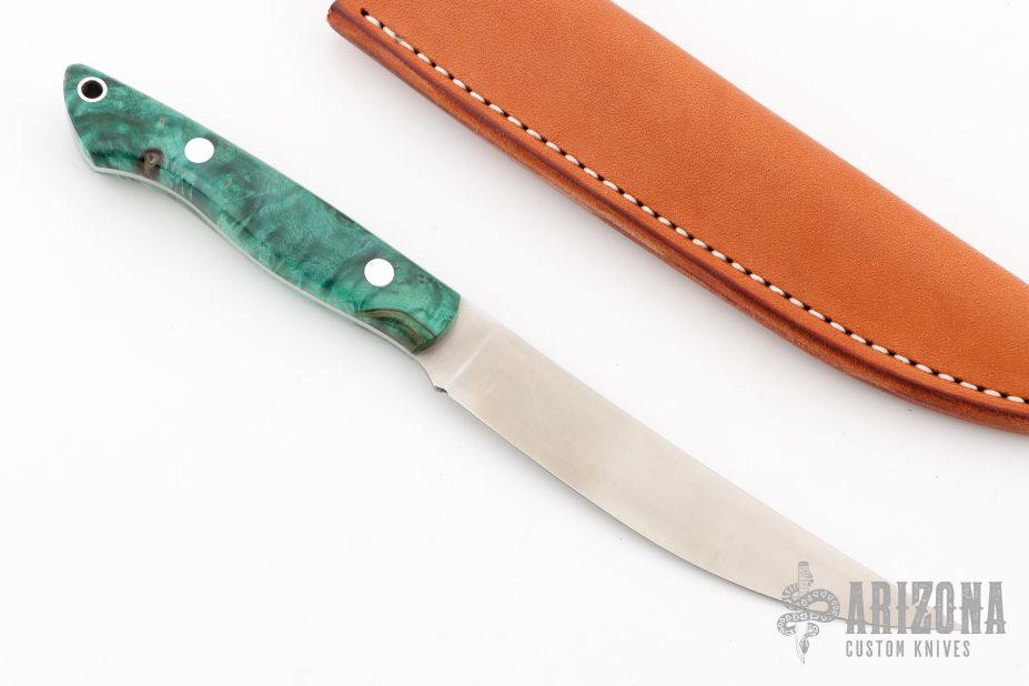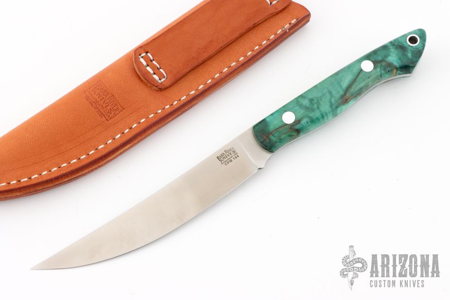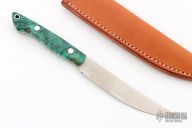 This Mini Kalahari Sportsman by Bark River Knives features a satin finished blade with .091" blade stock and .814" blade depth, full tang construction. The handle has green wood scales and a lanyard hole. Comes with brown leather sheath and original box. Excellent condition.