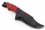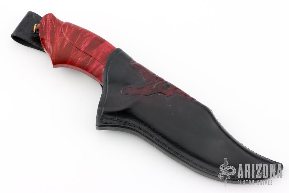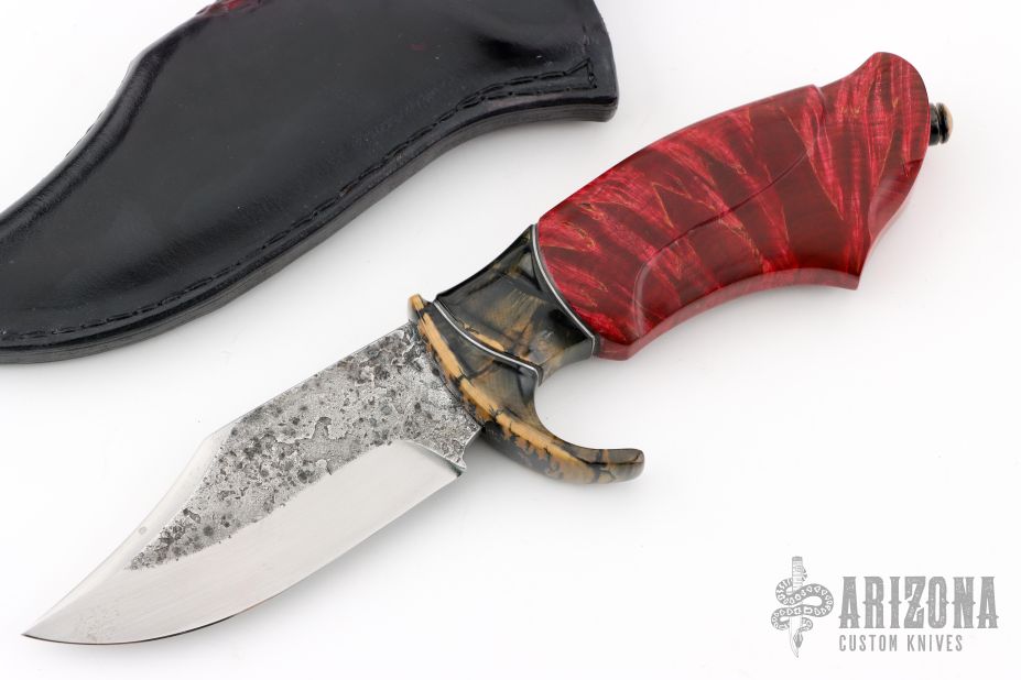 This knife by carlMichael features a Magnus Jonsson carbon steel blade with hand rub satin grinds and forge finished flats, false top edge, .135" blade stock and 1.422" blade depth, hidden tang construction. The handle has a stabilized mammoth ivory guard, curly beech wood grip, mammoth ivory finial. Comes with a hand tooled black leather sheath. New from maker at the 2025 Blade Show.