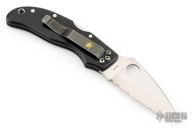 This Spyderco Calypso Jr. is a discontinued model with a satin finished blade with a fully serrated edge and black micarta handle. Includes original box. Has some scratches, otherwise good condition.