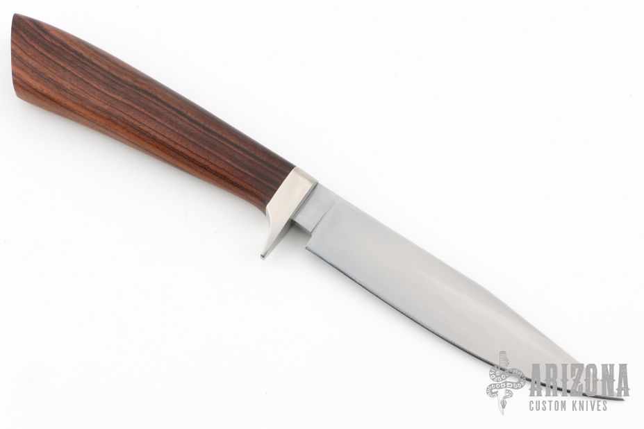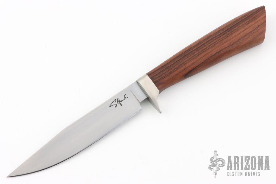 This Hunter by Santiago Abud features a hand rub satin finished blade with .147" blade stock and .905" blade depth, hidden tang construction. The handle has a stainless steel guard with wood grip. Comes with a zippered case. New from maker at the 2025 Blade Show.
