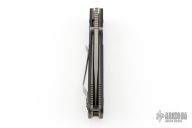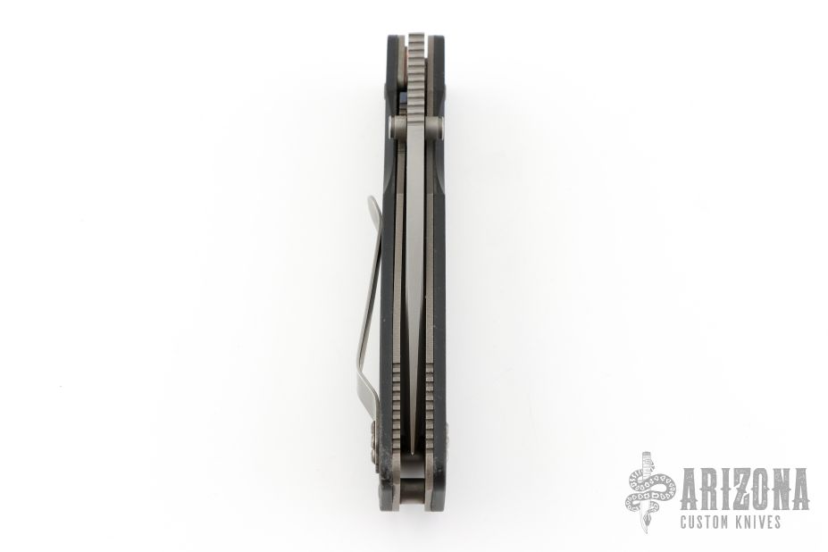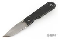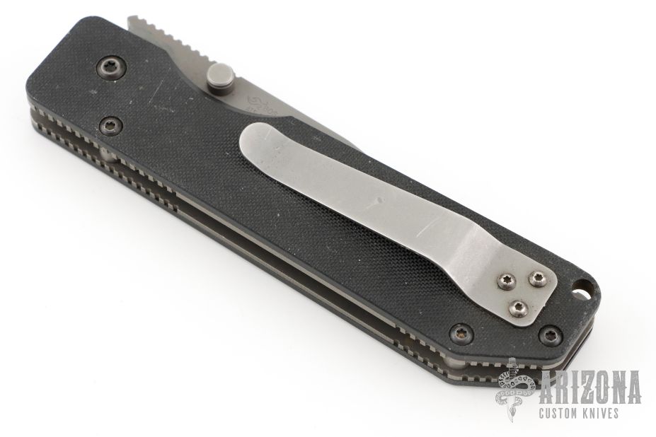 Tactical folder made by Buck with Strider engineering. Bead blasted tanto partially serrated blade with notched thumbrest and dual thumbstuds. The handle has black G-10 scales, bead blasted titanium liners, tip up stainless steel clip. Has a couple light scuffs, otherwise excellent condition.