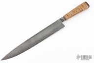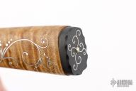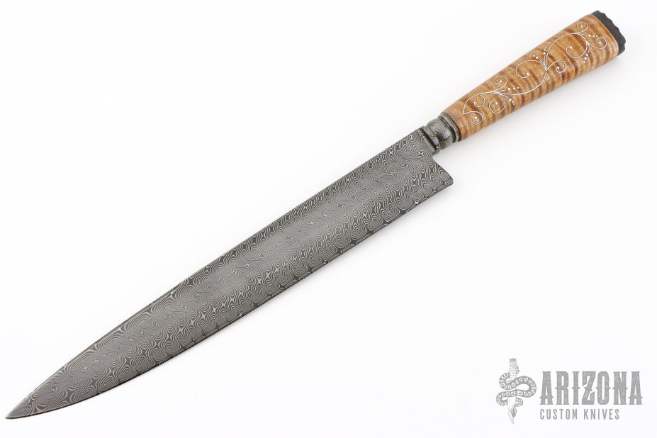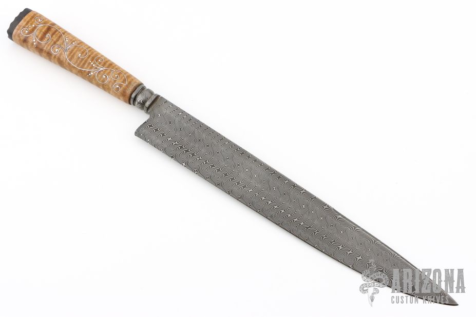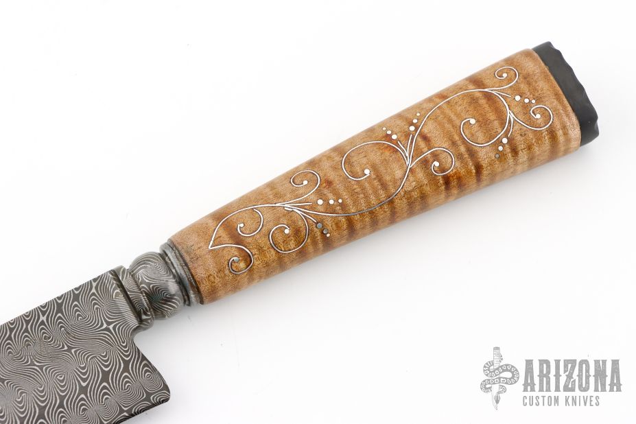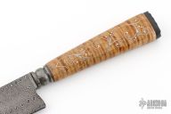 This Gaucho by Santiago Abud features a 4-bar Turkish Knot Damascus blade with integral fluted guard, .185" blade stock and 1.534" blade depth, hidden tang construction. The handle has a curly maple wood grip with .925 silver wire inlays on both sides, black steel butt with .925 silver wire inlays. Comes with a zippered case. New from maker at the 2025 Blade Show.