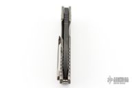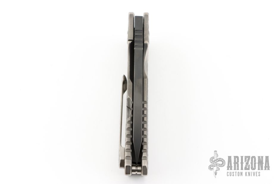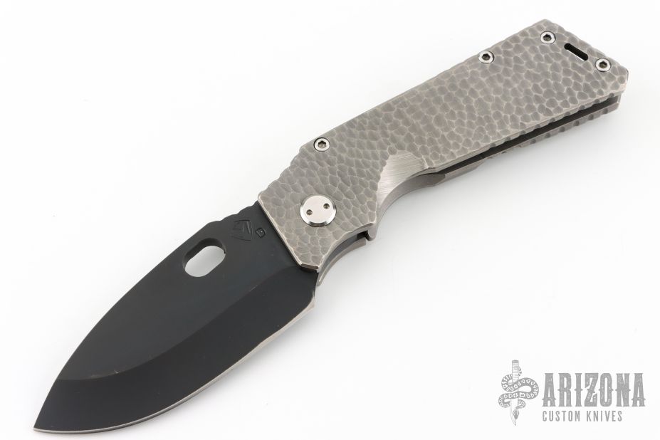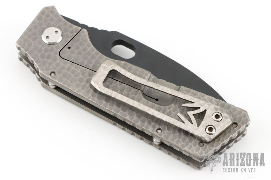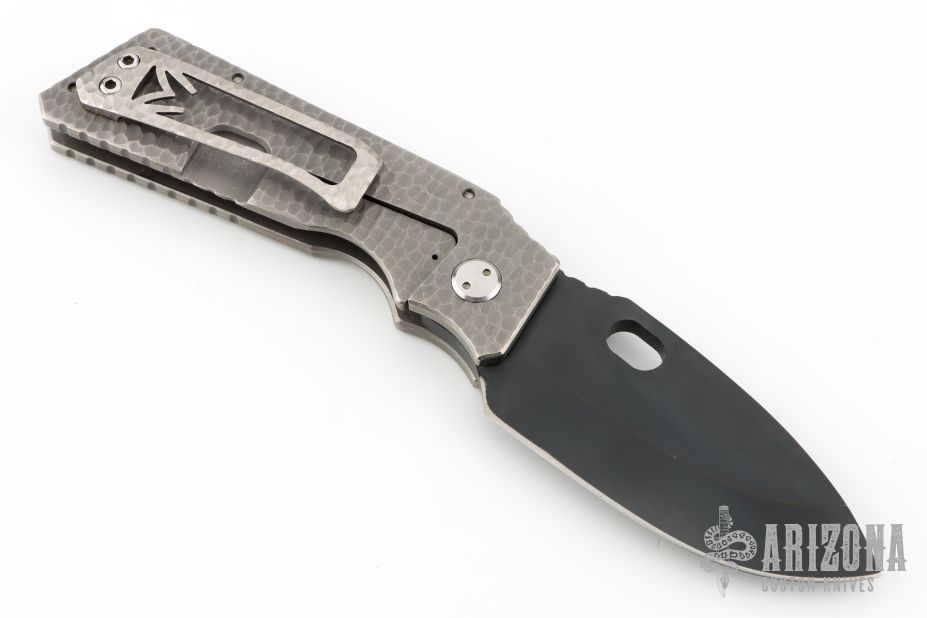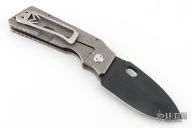 This TTF-1 by Medford Knife and Tool features a black drop point blade with thumb hole and notched thumb rest. The handle is comprised of a sculpted anodized titanium frame over titanium stand-offs. The machined titanium pocket clip is positioned for tip up, right hand carry. Comes with hard case maker's card, and original papers. Excellent condition.