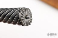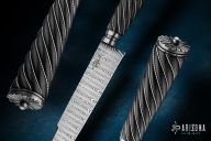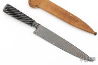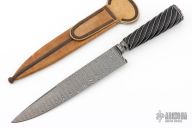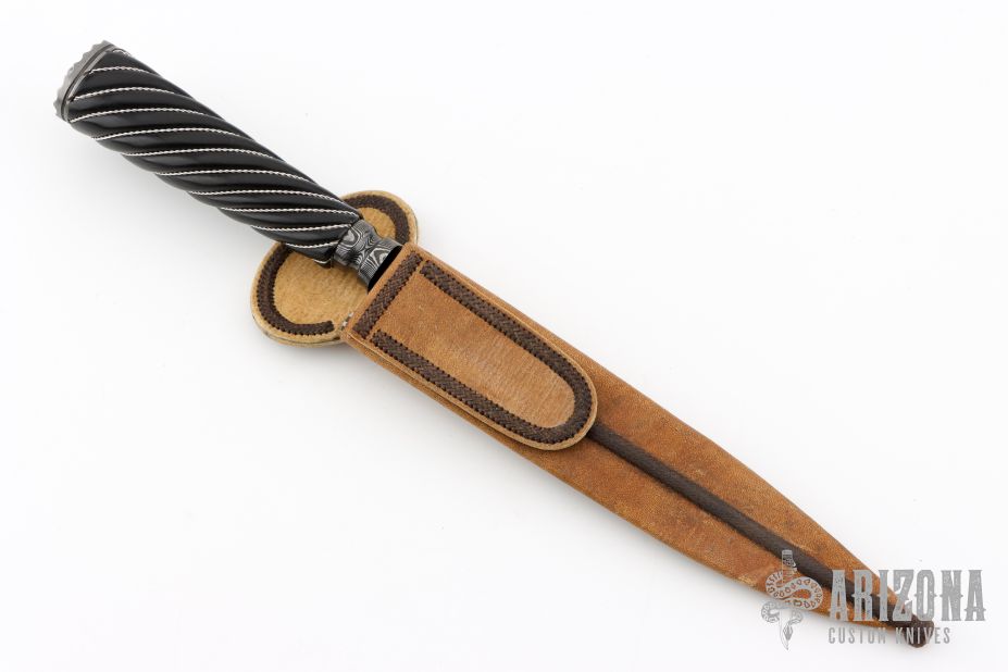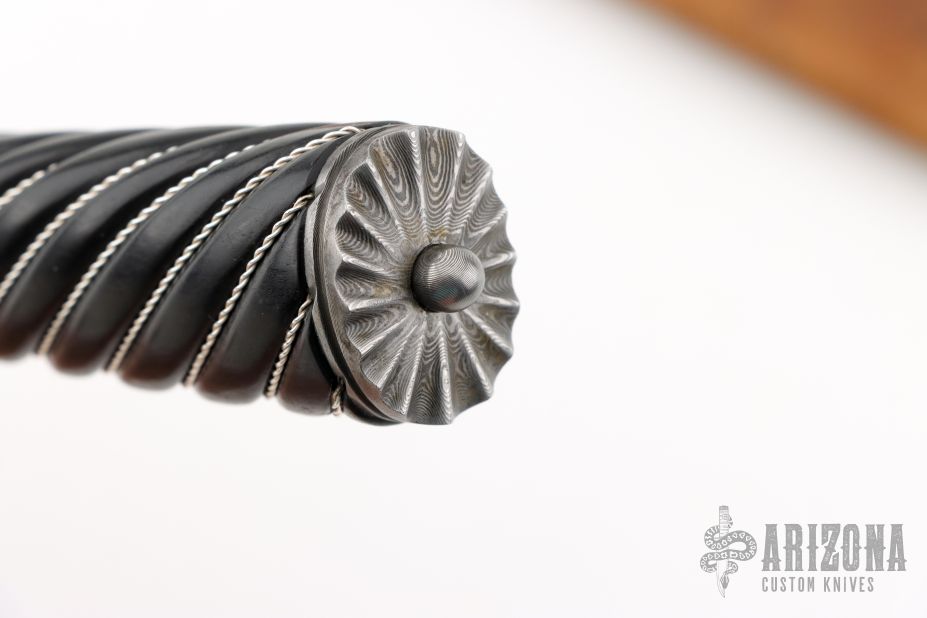 This Gaucho by Santiago Abud features a Ladder Pattern Damascus blade with integral fluted guard, .202" blade stock and 1.368" blade depth, hidden tang construction. The handle has a spiral fluted ebony wood grip with twisted .925 silver wire inlays, scalloped Damascus butt. Comes with a brown leather sheath and a zippered case. New from maker at the 2025 Blade Show.