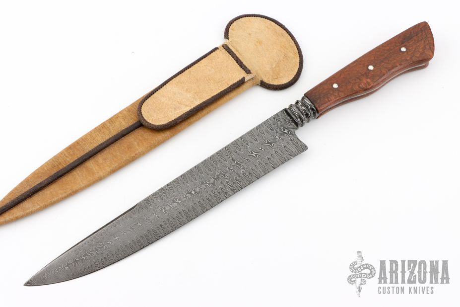 This Gaucho by Santiago Abud features a Twist Pattern Damascus blade with integral fluted guard and full tapered tang, .235" blade stock and 1.519" blade depth. The handle has lacewood scales with silver pins. Comes with a brown leather sheath and a zippered case. New from maker at the 2025 Blade Show.
