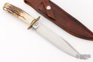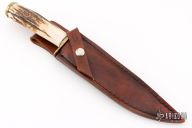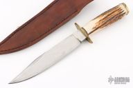 This Stag handled bowie from Master Smith Bill Bagwell features a Cable Damascus clip point bowie style blade with sharpened top edge, .340" blade stock at the ricasso and 1.323" blade depth, hidden tang construction. The handle has a brass guard and butt, stag grip, black/brass/red spacers, has a decorative twisted brass wire embellishment at the butt. Includes a brown leather sheath and a zippered case. Excellent condition for its age.