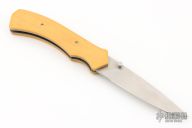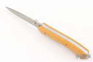 This left-handed Sidewinder II scale-release auto by Rainy Vallotton features a satin finished blade with dual thumbstuds. The handle has yellow paper micarta scales, titanium liners, stainless steel backspacer. #221. Nice action, lockup and blade seating. Excellent condition.