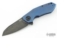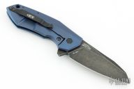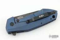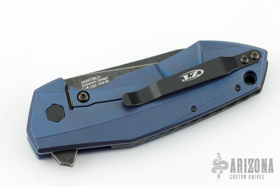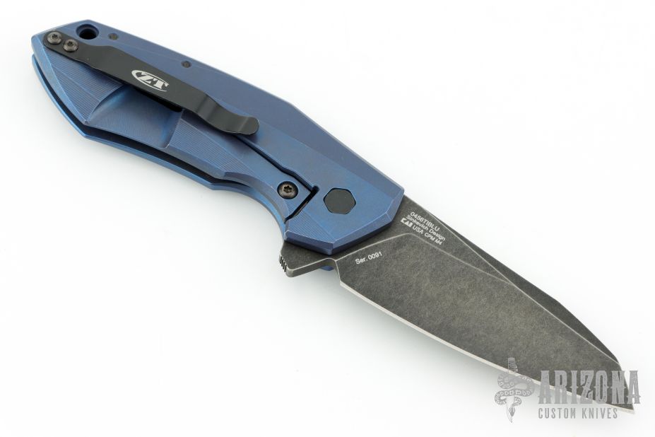 This ZT 0456 TI BLU by Zero Tolerance features an acid / tumble finished clip point blade with swedge and flipper. The handle has an anodized machined titanium frame over an anodized aluminum backspacer. Lanyard hole in pommel, black hardware, and stainless steel clip is positioned for tip up carry. Comes with original box and papers. Excellent condition. #0091