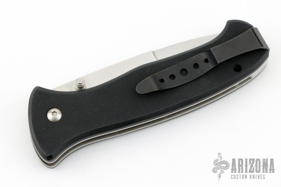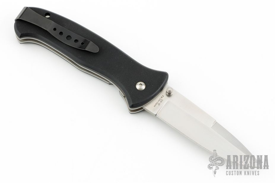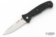 This SERE 2000 Linerlock Folder from Al Mar Knives has a satin finished VG-10 stainless steel drop/ spear point blade with dual thumb studs. Handle is black G10 over stainless steel liners, black stainless steel tip up clip, and lanyard hole. Has a couple light scuffs and scratches, excellent condition otherwise.