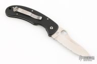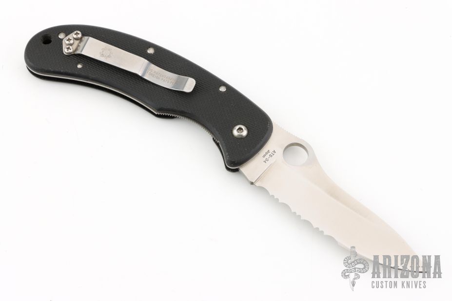 The Tim Wegner C48S by Spyderco is a very collectable Spyderco knife that has been discontinued and is designed to be a hunter with its large hunter trailing point blade. Tim Wegner ended up producing this knife with Blade Tech. Partially serrated and satin finished blade, ATS34. Textured black G10 handle. Stainless tip up carry clip and liner. Has a nice detent, lockup and blade seating. Includes original box.  Excellent Condition.