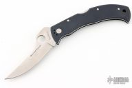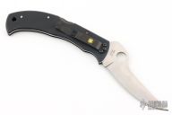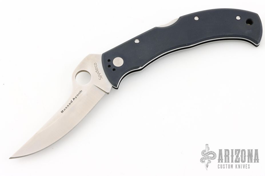 This C60P Massad Ayoob by Spyderco features a satin finished blade with thumbhole and notched thumbrest. The handle has a black aluminum frame with a black tip down reversible stainless clip. Includes the original box.  Has a couple light scuffs, otherwise excellent condition.