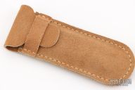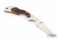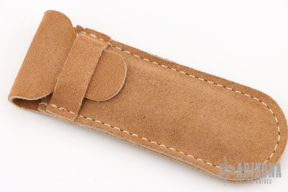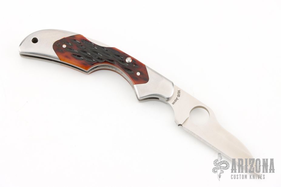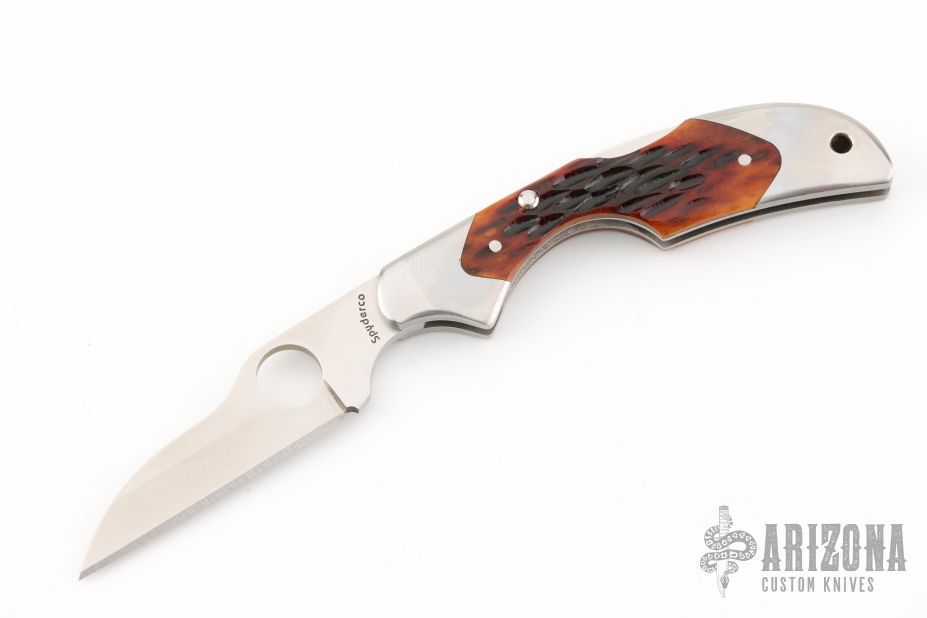 This Kiwi lockback folder by Spyderco has a satin finished wharncliffe blade with a thumbhole. The handle has stainless steel bolsters and liners and chestnut jigged bone scales. Comes with original box and a leather pouch. Excellent condition.