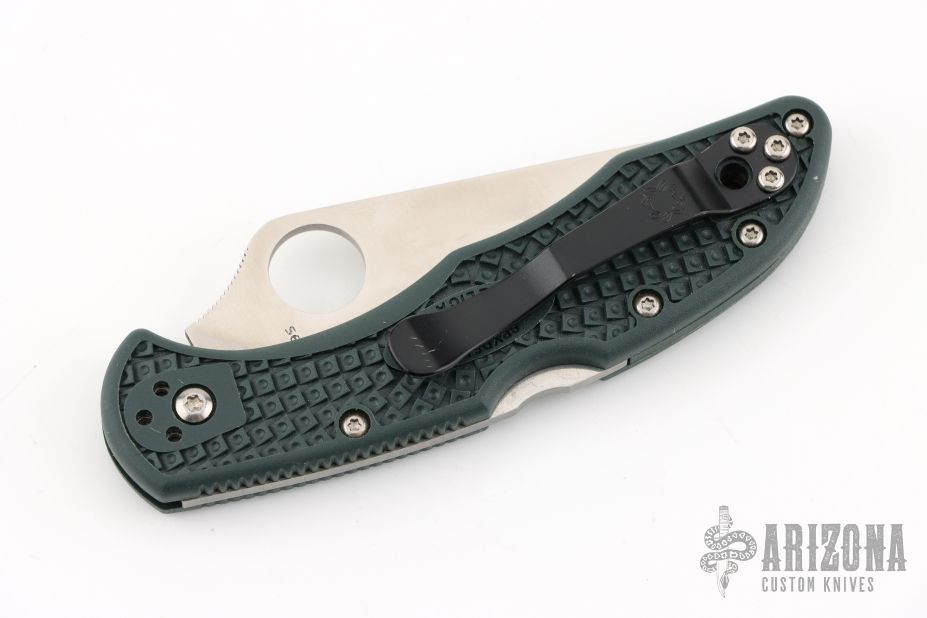 The blade on this Delica is ZDP-189, a powdered metal made by Hitachi that has phenomenal chemistry with 3% carbon. The hardness is around 64RC and edge retention is exceptional. The blade features spine jimping that extends from the ramp to the top of the handle. The Spyderco original thumb hole on the blade allows ambidextrous one-hand opening for right or left handers and the phosphor bronze washers at the pivot make the blade action smooth. The Delica has a lightweight FRN (fiberglass reinforced nylon) handle with skeletonized stainless steel liners and a strong back lock mechanism. The handle features screw construction for quick, simple cleaning and adjustment. The FRN scales utilize Spyderco's patented Bi-Directional Texturing to keep your hand from slipping under pressure. The pocket clip is 4-way reversible for tip-up/down and left/right carry.
