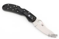 This Ocelot folder by Spyderco features a satin finished VG-10 blade with thumbhole and notched thumbrest. The handle has black G-10 scales, stainless steel liners and backspacer, and a 4-way reversible black stainless steel clip. Excellent condition. Comes with original box.