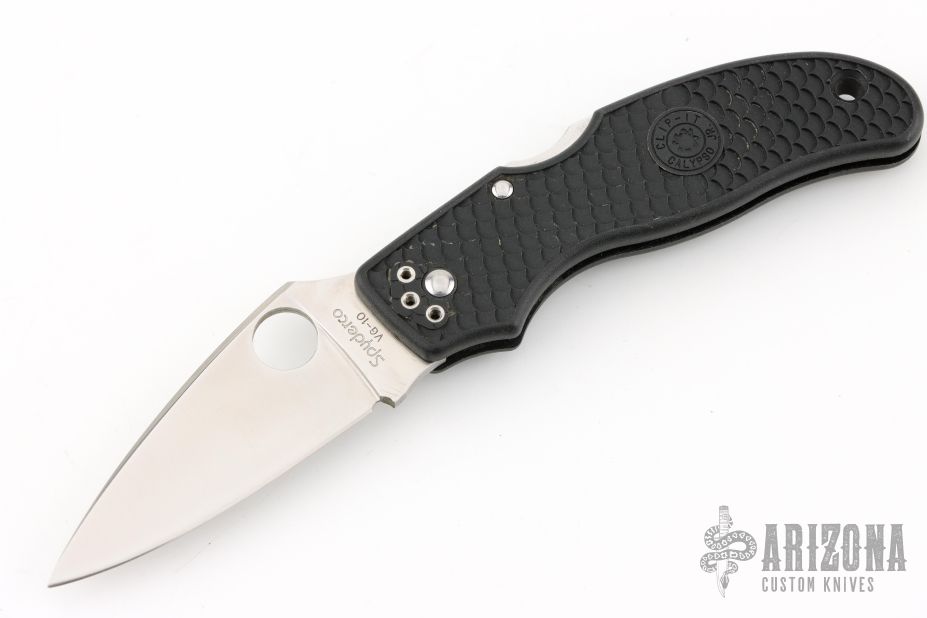 This Calypso Jr Lightweight by Spyderco features a satin finished blade with thumbhole. The handle has black FRN frame with tip down stainless steel clip. Comes with original box and papers. Has some light scratches on the clip, otherwise excellent condition.