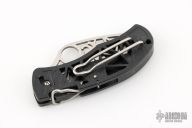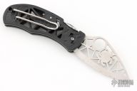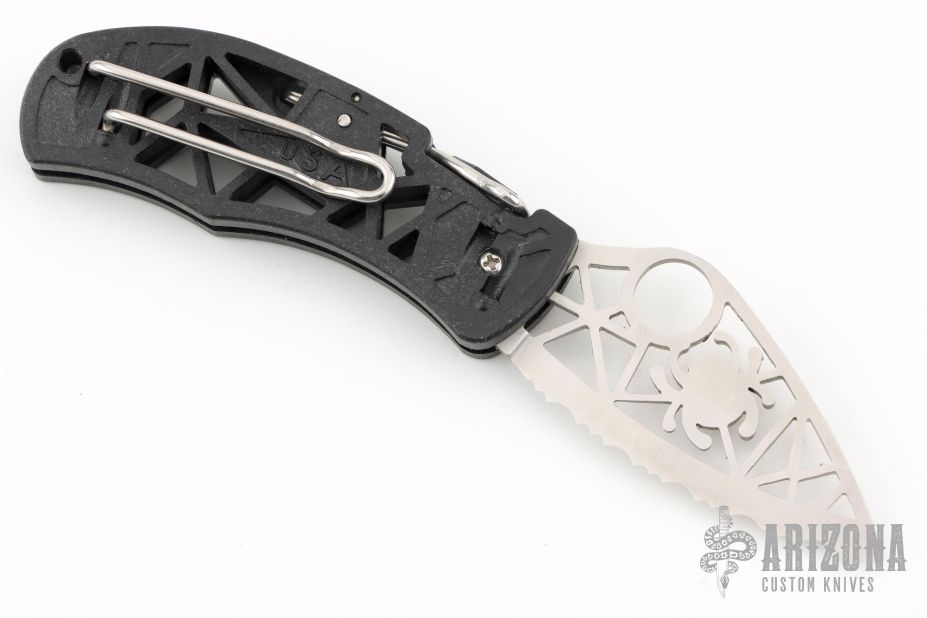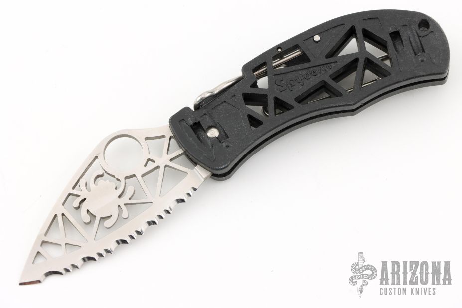 This Q Knife front-lock folder by Spyderco has a skeletonized satin finished stainless steel fully serrated blade with unique, clip-style front lock. Handle is black skeletonized polymer with 4-way reversible clip and lanyard hole. Comes with original box and papers. Excellent condition.