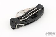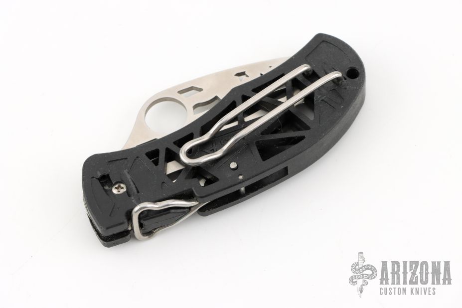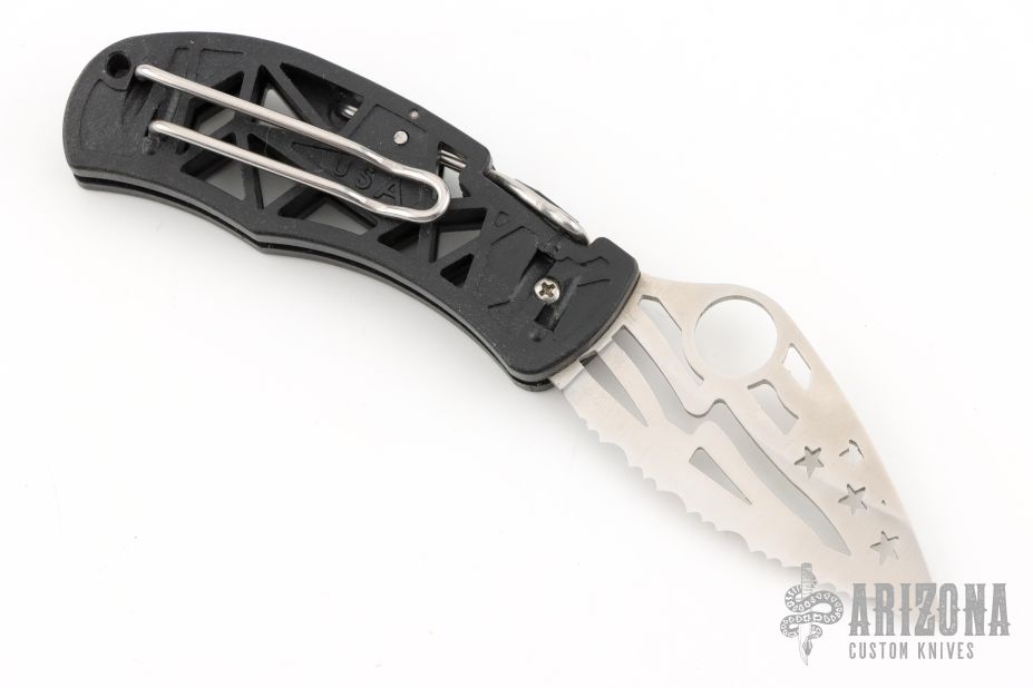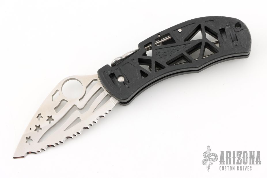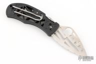 This Q Knife front-lock folder by Spyderco has a skeletonized satin finished stainless steel fully serrated blade with unique, clip-style front lock. Handle is black skeletonized polymer with 4-way reversible clip and lanyard hole. Excellent condition. Comes with original box and papers.