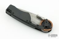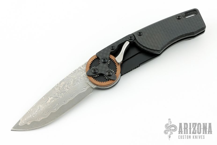 The 2021 Gearhead folding knife by Mantis Knives is the EDC counterpart to the previous Gearhead design. The "steampunk-style" Gearhead liner lock folder is equipped with a unique gear-driven pivot with one large gear, three small gears, and a thumb lever used to deploy the blade when pushed down. It features a flat ground 2.875" 62-layer Damascus blade and measures exactly seven-inches overall making it ideal for everyday carry. The handle scales are made from carbon fiber and aluminum with a stainless steel right-hand, tip-up pocket clip. The GH2028 series has a carbon fiber presentation scale and a copper-colored gear ring but it is available in a variety of styles and finishes.