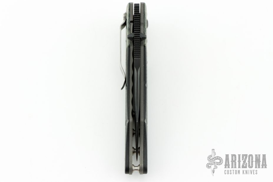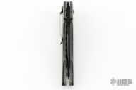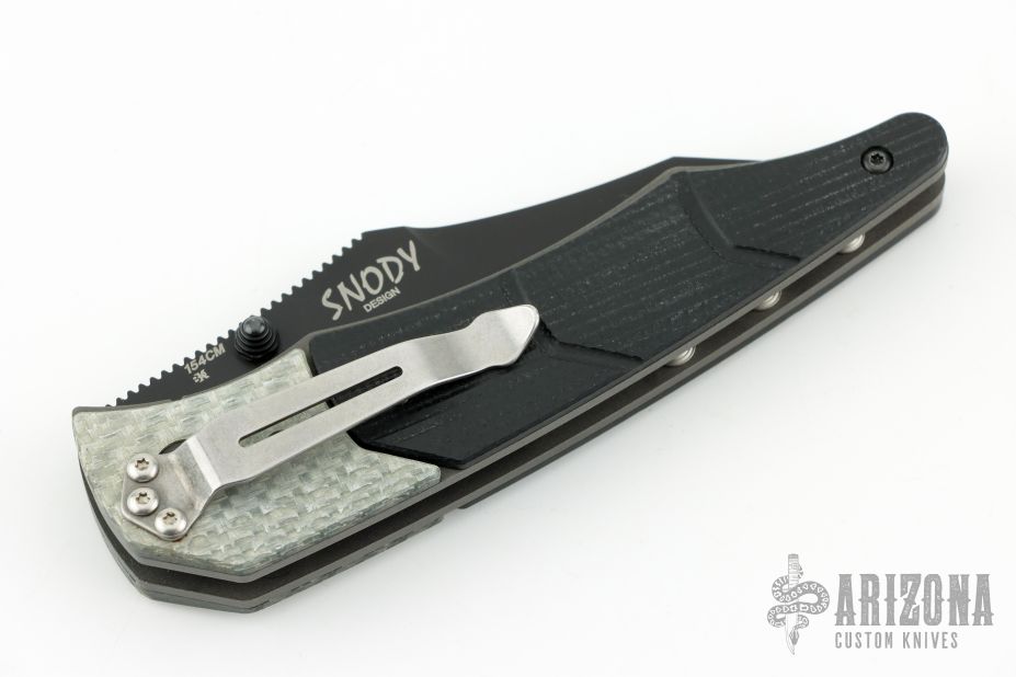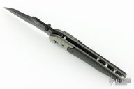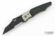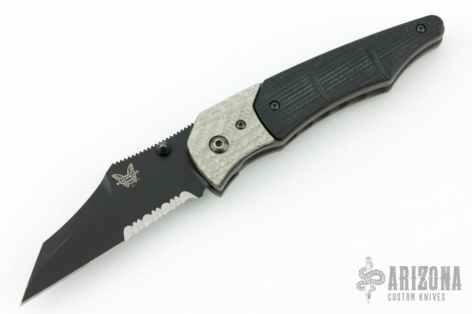 This Snody Design Gravitator folder from Benchmade features a black spear point blade with dual thumb-studs, serrations, and a notched thumb-rest. The handle has silver twill bolsters and black G-10 scales, with bead blasted titanium liners and stainless steel posts. Has a stonewashed stainless steel clip. Nice detent, lockup and blade seating. Has some scuffs and scratches, great condition otherwise.