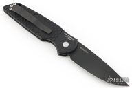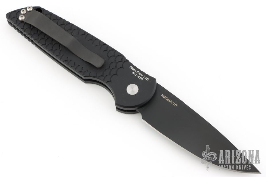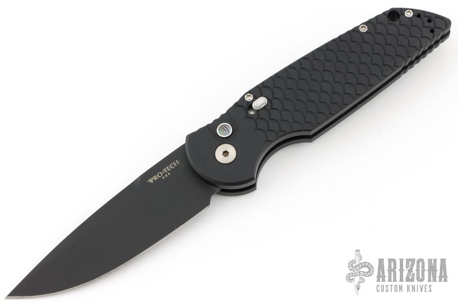 This Tactical Response TR-3 features a "Fish Scale" milled, black anodized aluminum body, which provides good traction and looks great. The blade has a black MagnaCut stainless steel with a plain cutting edge. The TR-3 is a knife that won't let you down. It fires hard, locks up like a rock, and feels great in hand. The slim design sits comfortably for tip-up pocket carry. Abalone is inset into the firing button, adding a unique and awesome flare to the piece.  Includes the original box and papers. Excellent condition.