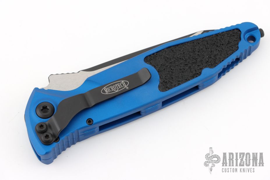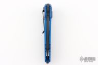 This Socom Elite Auto has a two-tone tanto blade with notched thumbrest. Blue aluminum handle with non-slip inserts. Stainless steel clip, tip down carry. Glass breaker. Dated 05/2019 and s/n 3274. Comes with original box. Excellent condition.
