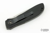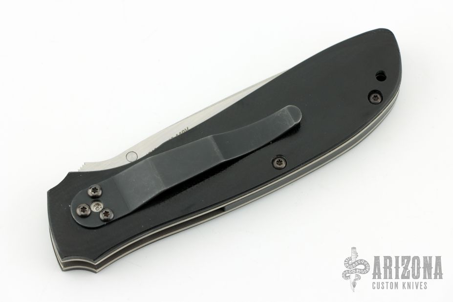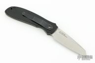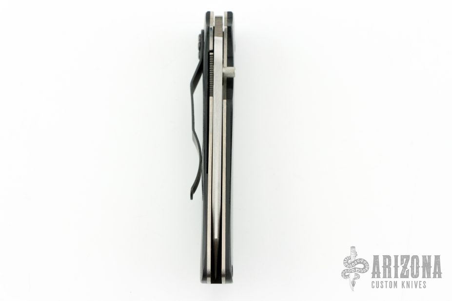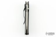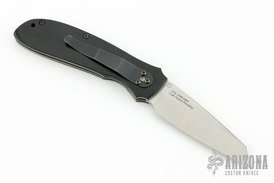 This Random Task Assisted Opening Linerlock Folder has a satin finished CPM 440V stainless steel wharncliffe blade, single thumbstud and notched thumb rest. Handle is black polished G10 with titanium liners, black G-10 backspacer, bead blasted titanium tip down clip, and lanyard hole. Excellent condition. Discontinued due to high cost of manufacturing, lots of hand done work. Comes with original box and papers.