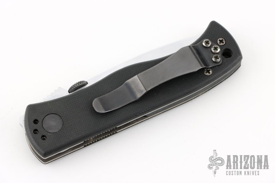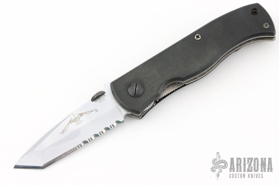 This CQC-7 from Emerson features a silver partially serrated chisel ground tanto blade with notched thumbrest, thumbhole and wave feature. The handle has black G-10 scales, titanium liners, black G-10 backspacer, and a tip up black stainless steel clip. Nice detent, lockup and blade seating. Has some scratches, has been resharpened, otherwise good condition. Comes with original box and papers. #322 and dated 2001