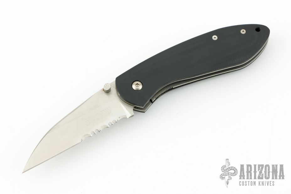 This 1500ST Mini Task is a Ken Onion design executed by Kershaw. It features a partially serrated wharncliffe style blade with swedge and single thumb stud. The handle is comprised of black G10 scales over titanium liners and black G10 backspacer. Lanyard hole in pommel. The black coated steel clip is positioned for tip down carry. Blade fires open cleanly on the speed safe assisted opening mechanism. Comes with original box and papers. Excellent condition.