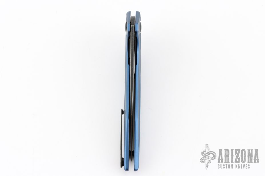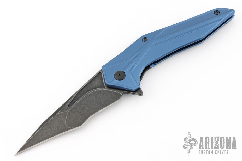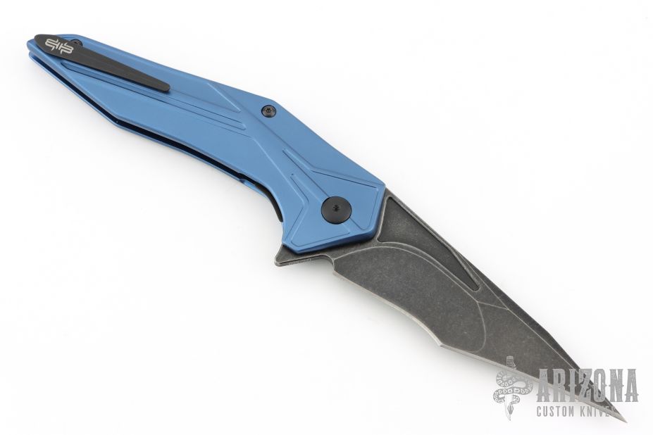 This Tyrant from Brous Blades features a blackwashed clip point recurve blade with swedge and notched thumb rust. The handle is comprised of blue aluminum scales over steel liners. Black finished stainless steel tip up pocket clip. Numbered #126/500. Includes padded vault style case, COA dated 10/28/16 and pivot tool. Has a couple light scuffs, otherwise excellent condition.