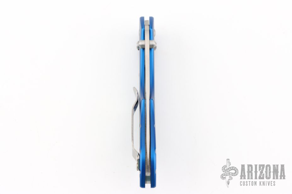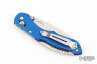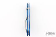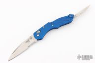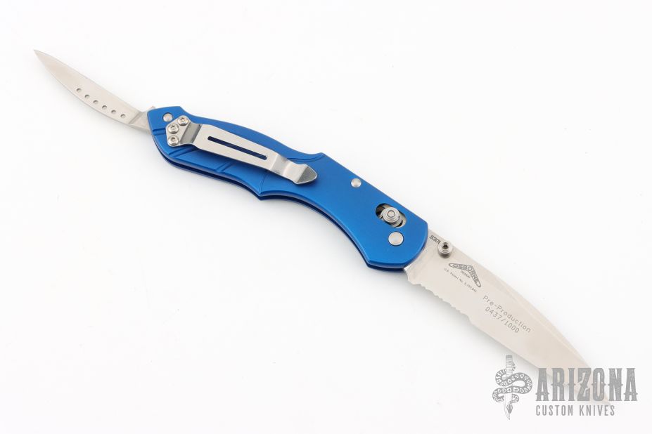 The Switchback is a Warren Osborne design featuring a main AXIS actuated blade and a slipjoint second blade on the back end. This Switchback has a satin combo edge blade and anodized blue frame. Coems with original box and papers. Excellent condition.