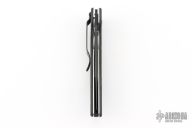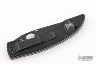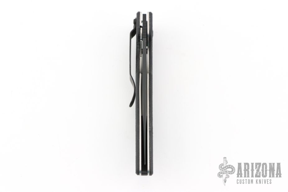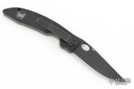 This Mini AFCK Linerlock folder by Benchmade has a black BT2 coated blade with thumbhole, and notched thumbrest. Handle is black G-10 over titanium liners, black fiber back spacer, lanyard hole. Excellent condition. Comes with original box and papers.