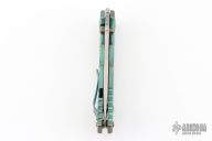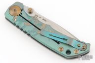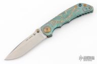 This Harsey framelock folder by Spartan Blades features a stonewashed drop point blade with dual thumbstuds and a notched thumbrest. The handle has an anodized titanium frame with laser engraving, a tip up titanium clip and filler tab. Has nice detent, lockup, and blade seating. S45VN. Comes with original box. Excellent condition.