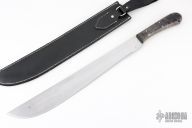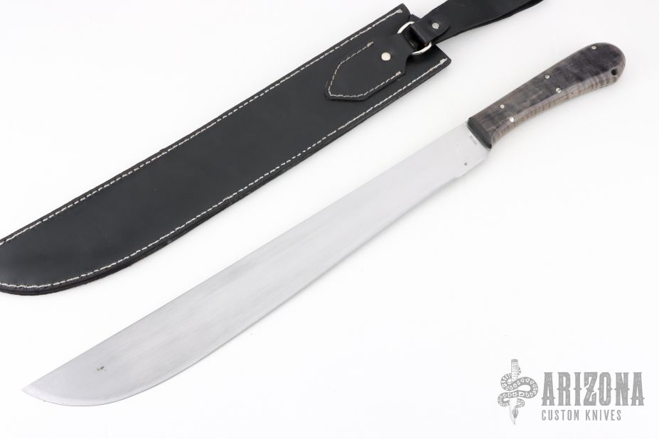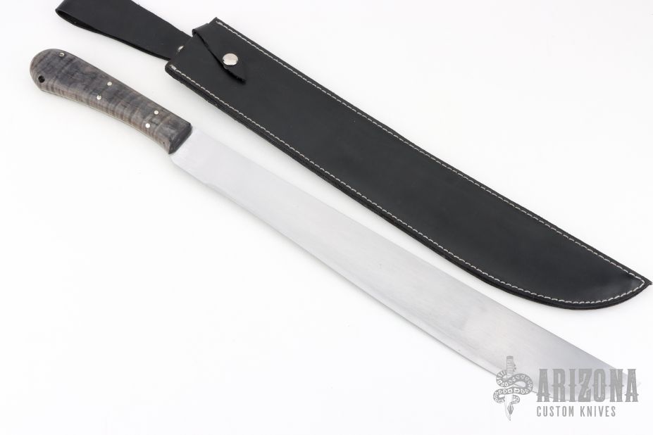 This Machete by Master Smith PJ Tomes features a hand rub satin finished blade with .075" blade stock and 2.350" blade depth, full tapered tang construction. The handle has curly maple wood scales. Comes with a black leather sheath. New from maker at the 2025 Blade Show. The keeper strap on this one has been cut. But it doesn't really hold the machete in anyways.