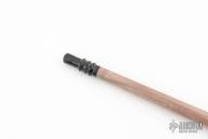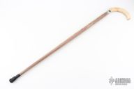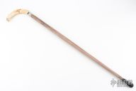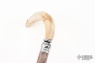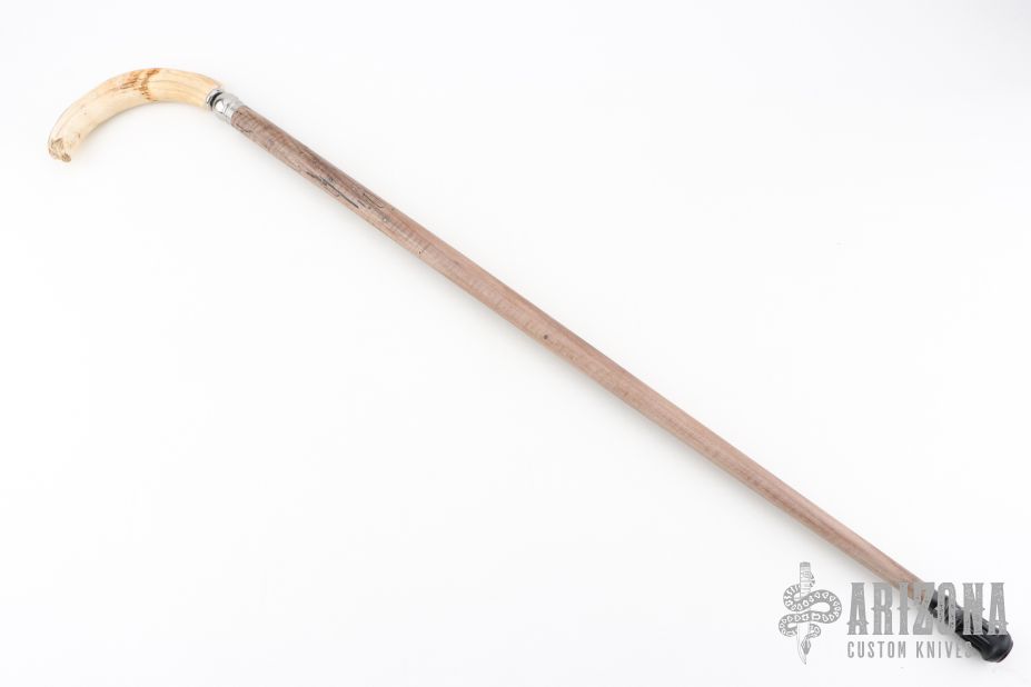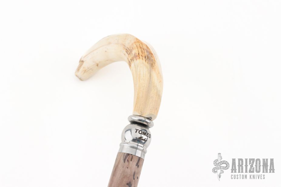 This cane by PJ Tomes features a warthog tusk handle with a turned stainless steel bolster/guard. The cane is dyed and stabilized curly maple with a carved buffalo end cap. New from maker at the 2025 Blade Show.