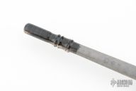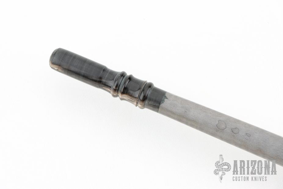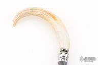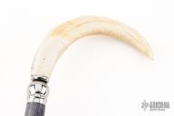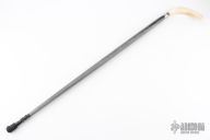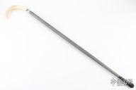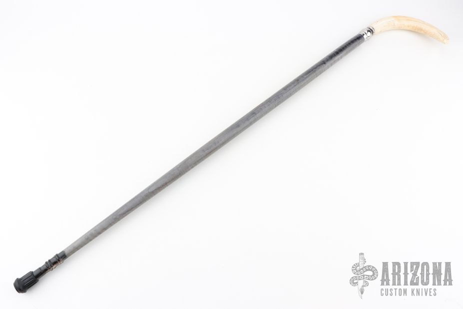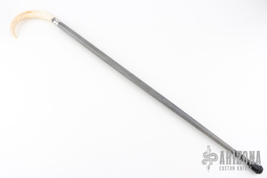 This sword cane by PJ Tomes features a black 420V stainless steel poignard blade with .318" blade stock. The handle has a warthog tusk with a turned stainless steel bolster/guard. The cane is dyed and stabilized curly maple with a carved buffalo end cap. New from maker at the 2025 Blade Show.